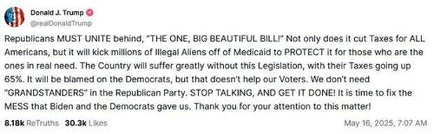 On Friday, Trump did his usual shit-talking to pressure Republicans into line - posting on Truth Social; “We don't need ‘GRANDSTANDERS’ in the Republican Party. STOP TALKING, AND GET IT DONE!”