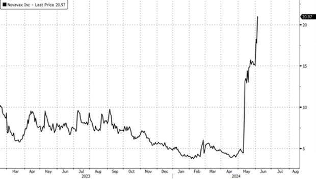 Shares of heavily shorted Novavax soared as much as 25% on Wednesday. Shares are up more than 400% since the end of April. Data from S3 Partners shows short interest topped 33% of the equity float.