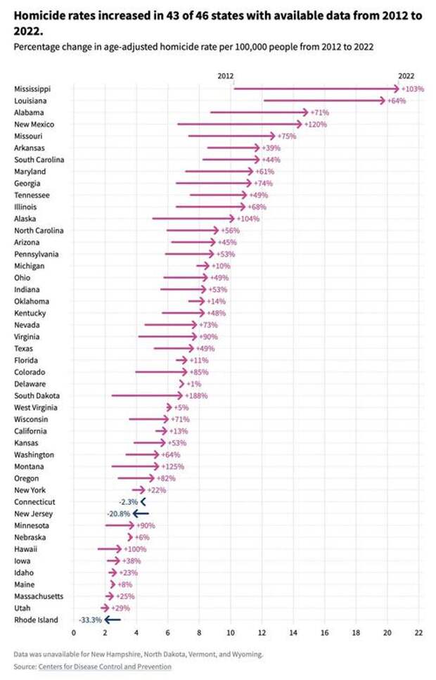 Murder rates doubled in at least six states over the decade: South Dakota (+188%), Montana (+125%), New Mexico (+120%), Alaska (+104%), Mississippi (+103%), and Hawaii (+100%).