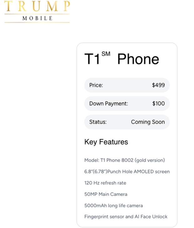 The Trump Organization stated that the "T1 Phone" will be a "sleek, gold smartphone engineered for performance and proudly designed and built in the United States for customers who expect the best from their mobile carrier."