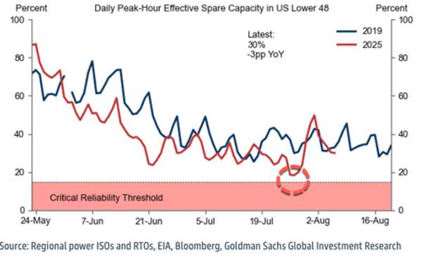 As of mid-August, 9 of the 13 U.S. regional power grids have already reached dangerously low spare capacity levels that are at or below the critical reliability threshold. This raises blackout threats and results in power price spikes during high-demand usage hours.