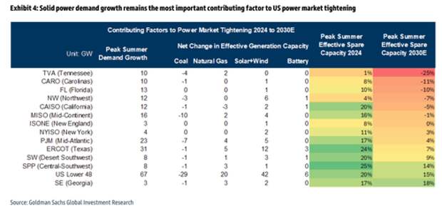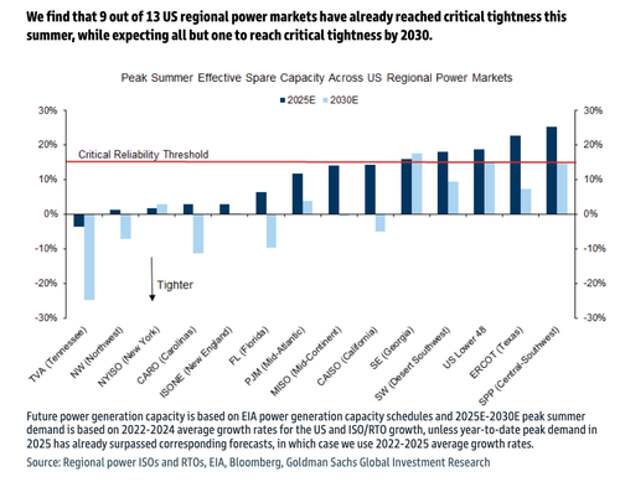 Now demand is surging, whether from AI data centers, EVs, or other electrification trends, which means there's a massive mismatch in power supply versus power demand.Goldman analysts led by Hongcen Wei have been tracking the power crisis and warned in a note on Wednesday that power market tightening has expanded from the three grids they covered last month (read here) to all regional markets.