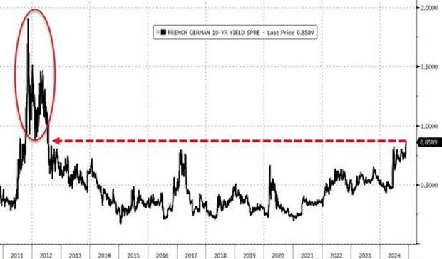 Amid a battle over the country's budget and an ongoing fiscal crisis, France's 10Y yield spread to Germany's has soared up to over 85bps - its highest since the European financial crisis - reigniting 'Frexit' fears as decoupling of the core countries accelerates...