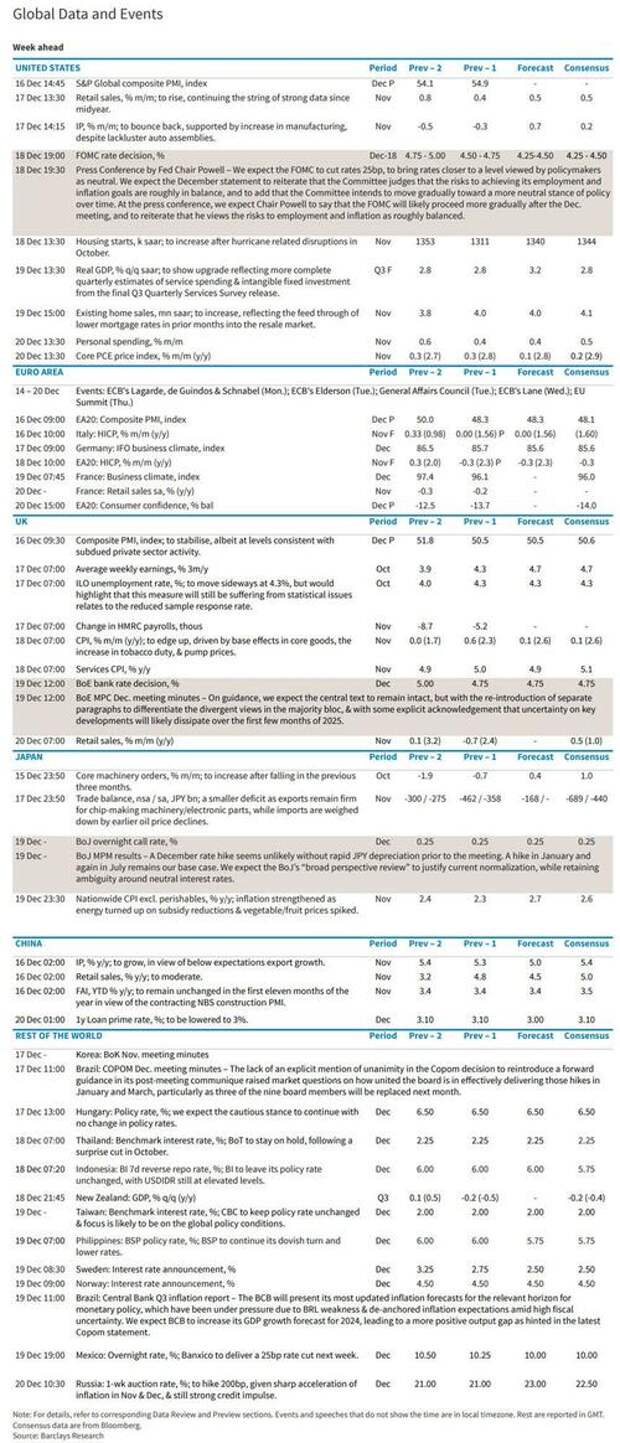 As we enter the last full week of the year, the natural winding down of activity will be punctuated by bursts of activity, centered around the Fed (Wednesday), the BoJ (Thursday) and the BoE (also Thursday) meetings. In terms of data, the highlights are the global flash PMIs today, US retail sales (tomorrow) and inflation prints from the US (PCE on Friday), Canada (tomorrow), UK (Wednesday), and Japan (Friday).