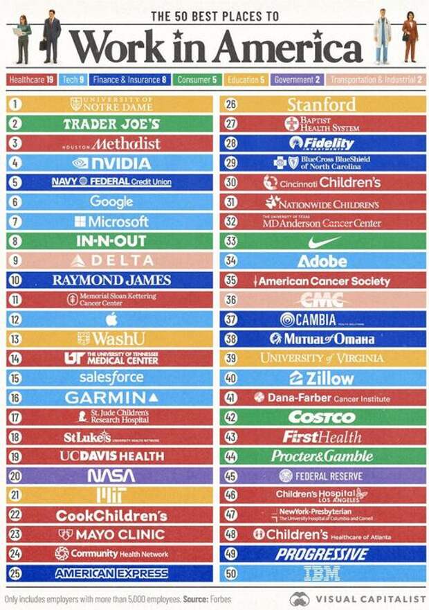 This graphic, via Visual Capitalist's Marcus Lu, highlights the 50 best places to work in America, based on Forbes annual employer ranking. For this analysis, only employers with over 5,000 employees were considered.