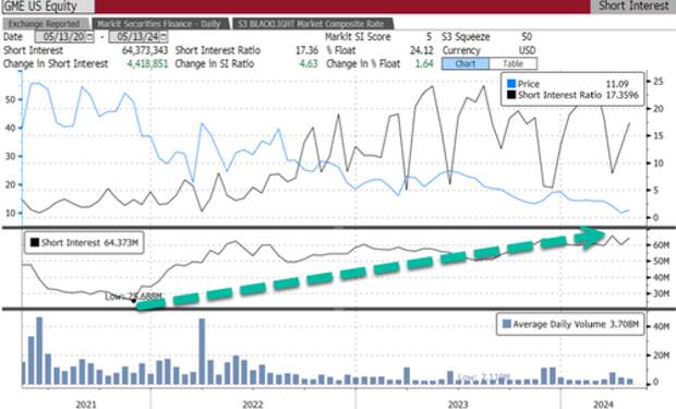 Roaring Kitty's return comes as the short percentage of GameStop shares outstanding has surged, doubling from 25 million in late 2021 to 60 million as of days ago, equal to about 24% of the float short.