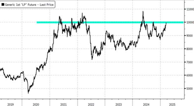 "Copper just keeps grinding as it takes out $10k, we said it will overshoot, and its overshooting! Nothing more to my eye than this is when GIR expect refined metal tightness to deliver deficits (2Q25 onwards) and US is dragging metal in that will be stranded," Goldman analyst James McGeoch penned in a note to clients earlier.