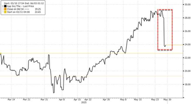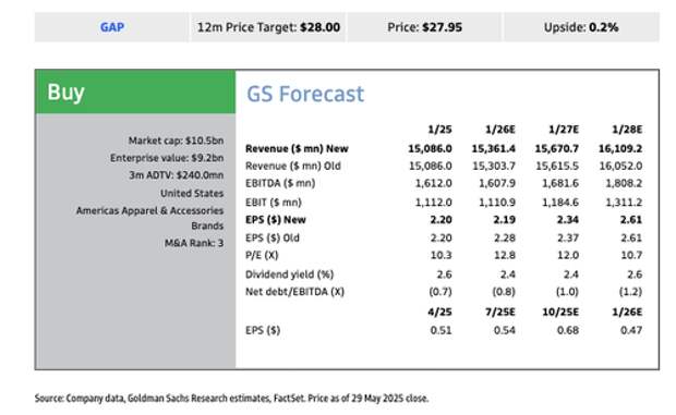 Citi analyst Paul Lejuez, who maintains a "Buy" rating on Gap, lowered his target to $30 from $33 due to the retailer's higher tariff burden.
