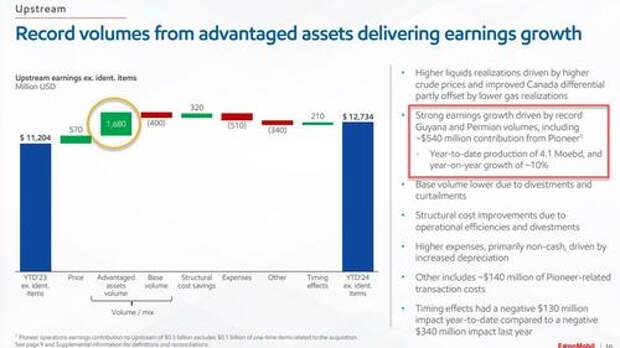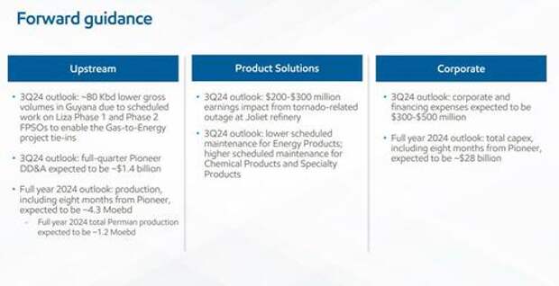 Production in Guyana and the Permian Basin reached all-time highs during the second quarter. Exxon is now the biggest producer in the Permian after closing the Pioneer transaction, its biggest deal since buying Mobil.