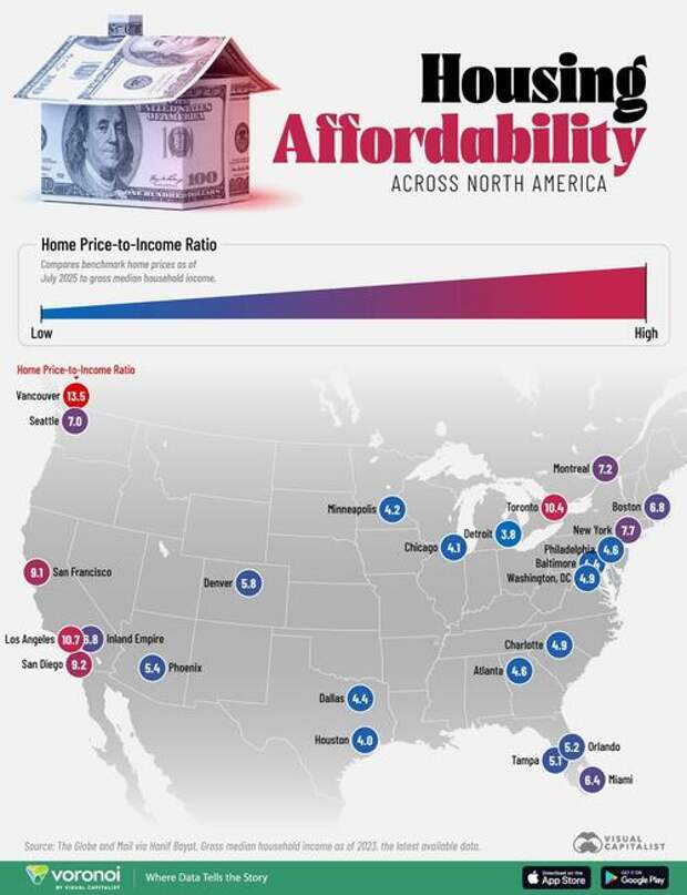 This graphic, via Visual Capitalist's Dorothy Neufeld, shows housing market affordability in North America, based on data from the Globe and Mail via Hanif Bayat.