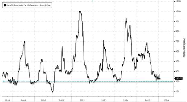 Bloomberg reports a bumper Mexican harvest after heavy rainfall has driven record US imports ahead of the Super Bowl, pushing supplies higher while driving prices lower, a perfect mix for millennials in the K-shaped economy.
