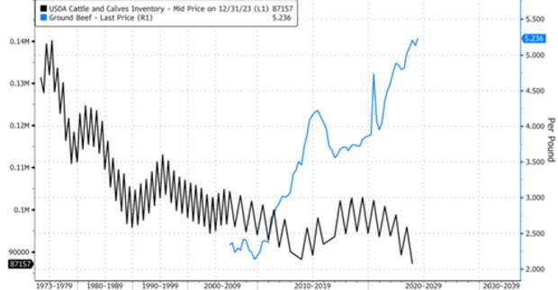 Meanwhile, USDA data shows that ground beef prices at supermarkets average $5.2 per pound. Prices are soaring in response to the nation's herd size collapsing to multi-decade lows.