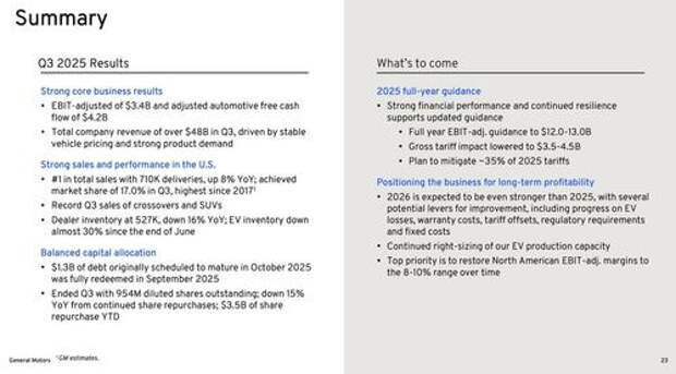 GM shares are trading up about 11% this morning after the automaker delivered stronger-than-expected third-quarter results and raised its 2025 outlook. The company reported adjusted EPS of $2.80 versus $2.31 expected and revenue of $48.