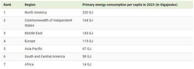 North America’s numbers are in contrast to regions like Africa, that consumes 14 GJ per capita, or even South and Central America at 58 GJ per capita.