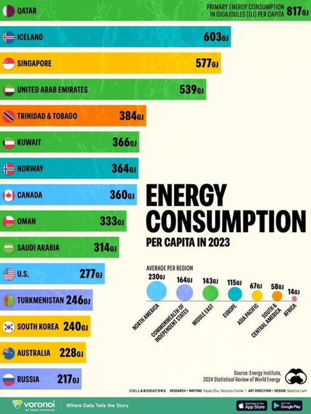 This chart below, via Visual Capitalist's Kayla Zhu, shows the top 15 countries by energy consumption per capita in 2023, as well as the consumption per capita for each global region.