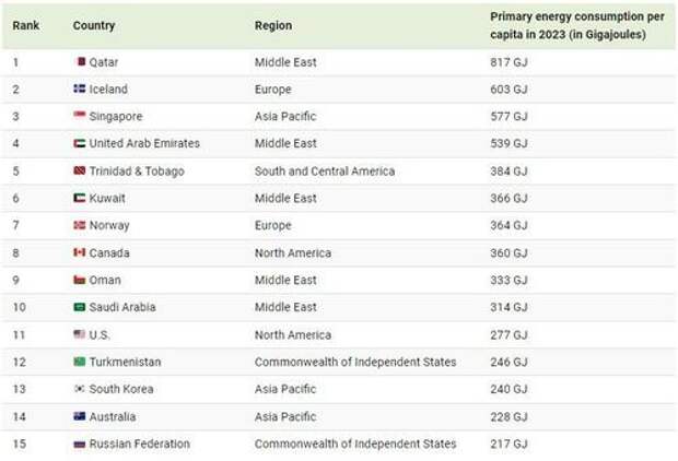 Qatar had the highest per capita energy consumption worldwide in 2023 at 817 GJ per person. Almost all of the country’s energy consumption is derived from natural gas, of which the country has abundant reserves.