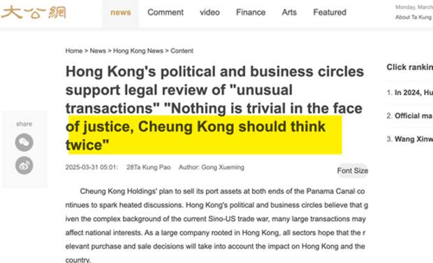 Earlier today, the Pro-CCP Ta Kung Pao paper unleashed its propaganda cannon, which included comments from Hong Kong politicians and Chinese lawyers urging CK Hutchison to terminate the deal.