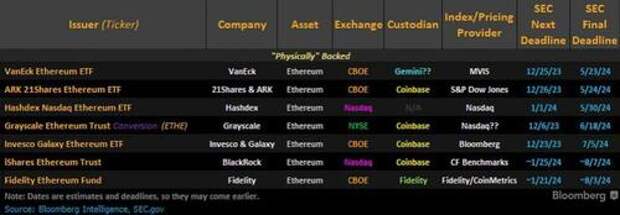 This time, VanEck is the first in line with a deadline of May 23, 2024. The deadline for BlackRock’s application is in August, but while typically we would expect the world's largest asset manager to dictate the terms of the approval, the securities watchdog has already instituted proceedings on VanEck's applications.Ethereum ETF deadlines. Source: Bloomberg Intelligence