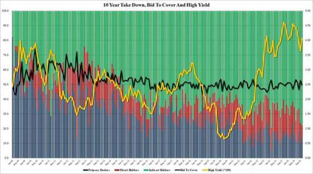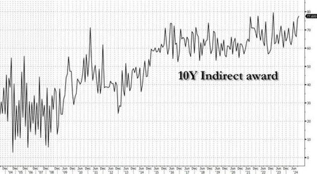 Curiously, the internals were not bad at all, perhaps as foreign central banks sought to load up on US paper now that yields are back over 4%, and the Indirect takedown rose to 77.6%from 761%, and just shy of the all time high hit in Feb 2023 when indirects took down just under 80%.