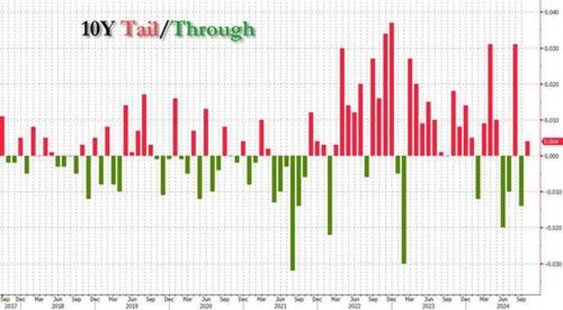 The auction stopped at a high yield of 4.066%, up sharply from last month's 3.648% (which was the lowest since May 2023), and tailed the When Issued 4.062% by 0.4bps, a big reversal from last month's 1.4bps through auction (but nowhere near as bad as the 3.1bps tail in August).