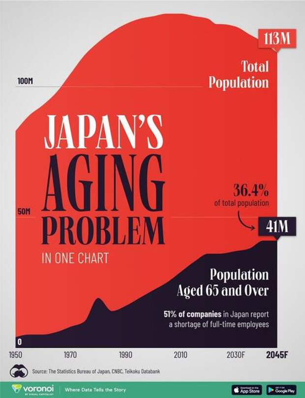 This graphic, via Visual Capitalist's Bruno Venditti, visualizes Japan’s population aged 65 and over compared to the total population from 1950 to 2045 forecasts, based on data compiled by the Statistics Bureau of Japan.