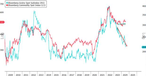 Meanwhile, Bloomberg's Mike McGlone noted grain deflation while broader commodity markets remained positively diverged:
