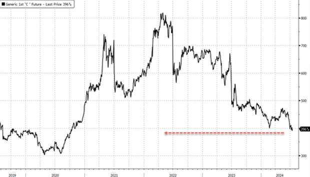 "The US farmers, who are the world's largest corn producers, have been holding off selling early in the season as prices of the key grain slide toward $4 a bushel for the first time since 2020."