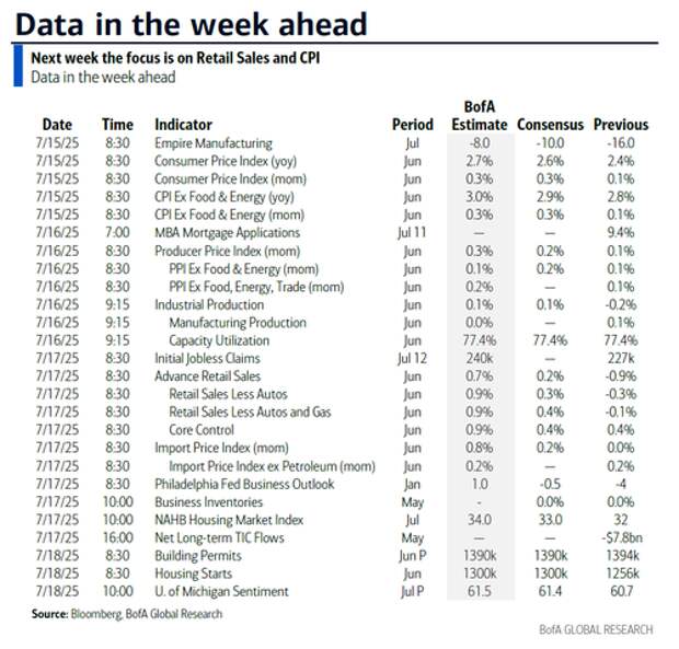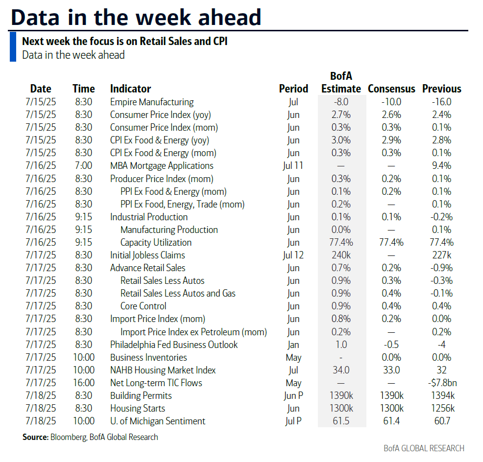 Before we preview these, the other key global releases are the other CPI numbers in Canada (also tomorrow), the UK (Wednesday) and Japan (Friday). In the US, there will also be retail sales (Thursday) and industrial production (Wednesday) reports for June, along with the preliminary University of Michigan survey (Friday) for July. Claims on Thursday corresponds to payroll survey week so it’ll be interesting to see whether the recent improvements continue given the payroll implications. Growth will also be in focus in China, where Q2 GDP and June activity data are out tomorrow. Also important will be the US banks kicking off the Q2 earnings season tomorrow, with semiconductor firms ASML and TSMC also reporting this week.Lets now delve into the main upcoming US data, especially the inflation numbers. According to DB's US economists’ preview they expect a +0.9% increase in seasonally adjusted gas prices and solid food inflation to boost the headline CPI (+0.34% forecast vs. +0.08% previous) slightly above that of core (+0.32% vs. +0.13%) which would increase the year-over-year growth rate by three- and two-tenths respectively (to 2.7% and 3.0%), and the three- and six-month annualized rates by 1.1 percentage points (to 2.8%) and three-tenths (to 2.9%), respectively. The economists will be looking mostly at signs of tariff related inflation in the core good categories. Wednesday’s PPI data will also be important for the categories that feed through into core PCE, the Fed’s preferred inflation gauge.
