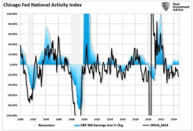 The CFNAI’s broad scope provides a nuanced view of how various economic forces combine to affect corporate earnings. With production and employment metrics deteriorating, the outlook for robust earnings in 2025 appears increasingly strained. As shown, a high but volatile historical correlation exists between the CFNAI and corporate earnings.