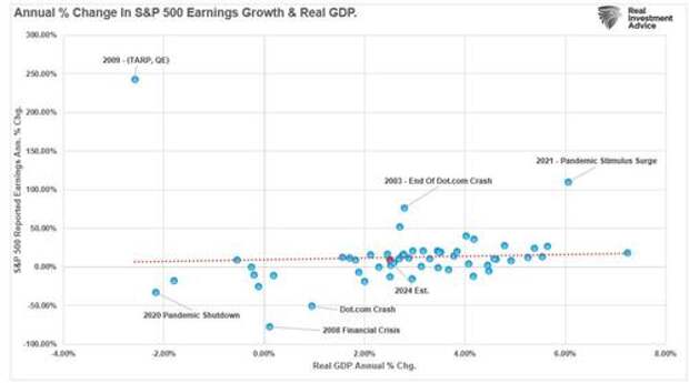 A better way to visualize this data is to look at the correlation between the annual change in earnings growth and inflation-adjusted GDP. There are periods when earnings deviate from underlying economic activity. However, those periods are due to pre- or post-recession earnings fluctuations. Currently, economic and earnings growth are very close to the long-term correlation.
