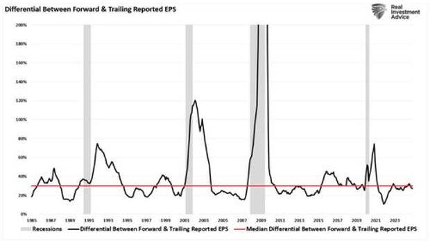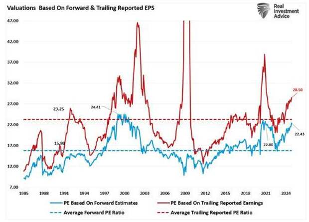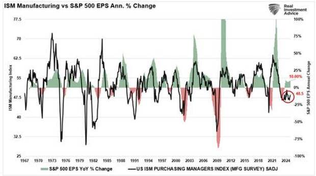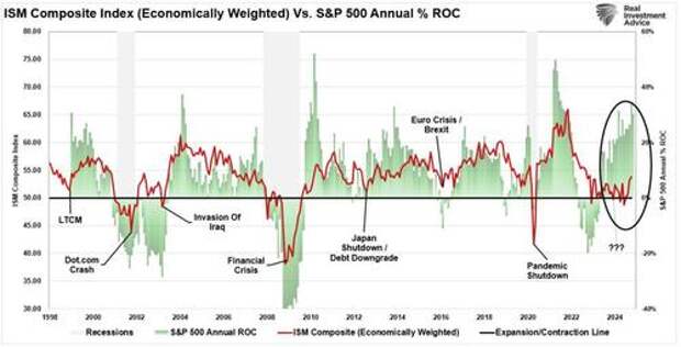 As shown, corporate earnings growth, which correlates with economic indicators like the ISM Manufacturing index, suggests some caution in the more optimistic Wall Street estimates. However, even if we include the services side of the index, which comprises the bulk of economic growth, and weight it accordingly, we see that the stock market has far outpaced underlying economic activity. Historically, such outsized returns were unsustainable as earnings growth could not meet expectations.