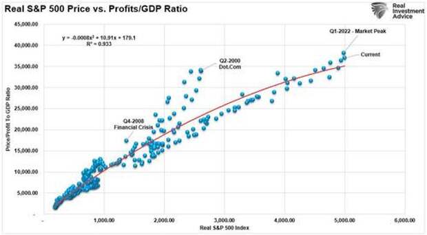However, as we discussed previously, there is also a high correlation between the market and the corporate profits to GDP ratio. As is the case currently, markets can detach from underlying economic realities due to momentum and psychology for brief periods. However, those deviations are unsustainable in the long term, and corporate profitability, as discussed, is derived from underlying economic activity.