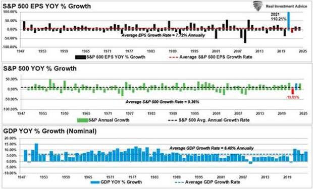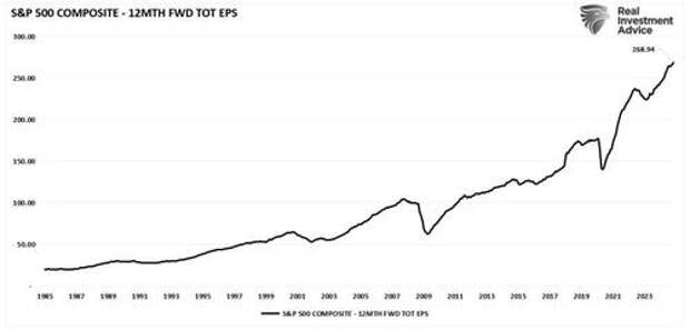 This relationship underscores why GDP is a cornerstone for assessing earnings trends. We can also see this visually.“Since 1947, earnings per share have grown at 7.7% annually, while the economy expanded by 6.40% annually. That close relationship in growth rates should be logical, particularly given the significant role that consumer spending has in the GDP equation.” – Market Forecasts Are Very Bullish