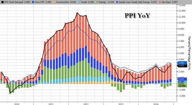 Headline PPI surged 0.4% MoM (+0.2% MoM exp) - biggest MoM jump since June - which lifted the YoY rise in producer prices to +3.0% - far above expectations and the highest since Feb 2023...