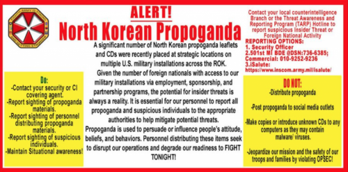 U.S. Forces Korea, a sub-unified command of the United States Pacific Command, has issued a warning to servicemembers on the Korean Peninsula to stay vigilant for “insider threats” after North Korean propaganda surfaced on American military bases.