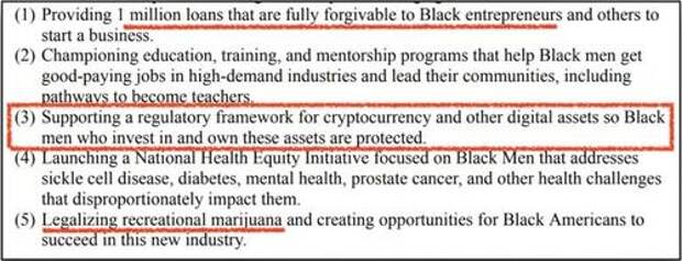 The Dems actually read the room for a change and try to effect a panic pivot to tone down the Bitcoin Derangement Syndrome, but the best they could do was some weird woke crypto pronouncement called “Opportunity Agenda for Black Men” (since deleted from the Kamala Harris website) that promised $20K forgivable loans to black men, and – because they’re black, I guess – access to weed.