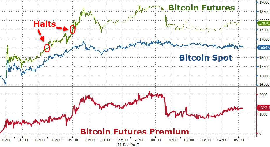 Despite broadly-spewed sentiment last week that Bitcoin futures would herald the end of Bitcoin as 'shorts' could finally capitalize on the 'tulipmania', for now, they have failed to turn up as the January-expiring futures are holding a 8% premium to spot prices and remain up around 19% from their opening print overnight.
