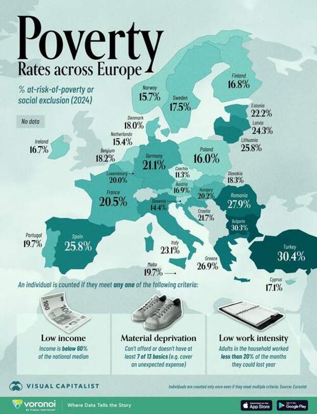 The map below, via Visual Capitalist's Pallavi Rao, spotlights Europe’s poverty rates in 2024, measured by the share of people at risk of poverty or social exclusion in each country.