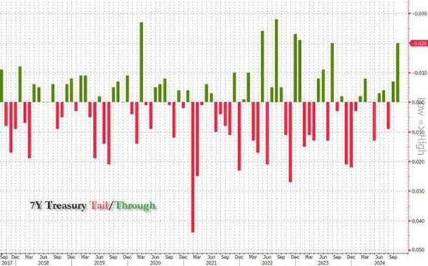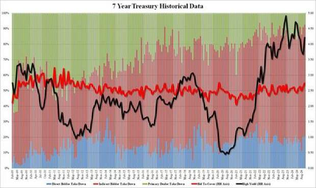 After two ugly auctions yesterday to start the week, moments ago the Treasury concluded the truncated week's coupon issuance when it sold $44 billion in 7Y paper in what was a stellar auction.