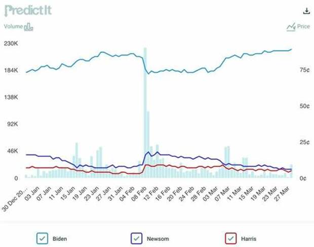 All this will hit this summer as Mr. Newsom’s presidential ambitions could still advance should President Joe Biden’s mental faculties decline much further. All that still is a long shot, of course. The PredictIt betting on Mr. Newsom gaining the nomination has been decreasing lately (middle line in the graph below), from 18 cents on Feb. 9 to 6 cents on March 29. Mr. Biden’s (top line) rose from 72 cents to 89 cents. Vice President Kamala Harris finished at 4 cents, below Mr. Newsom.