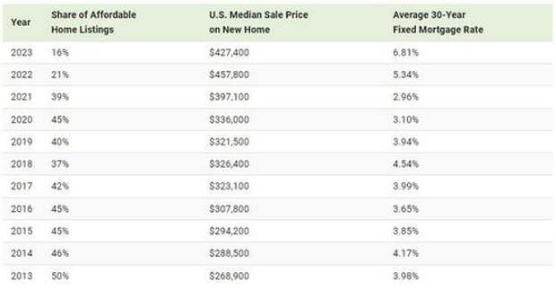 While affordable homes made up 39% of the market in 2021, the share dropped precipitously as interest rates climbed higher. In 2023, the average annual 30-year fixed mortgage rates reached 6.81%—hitting its highest level in 20 years.