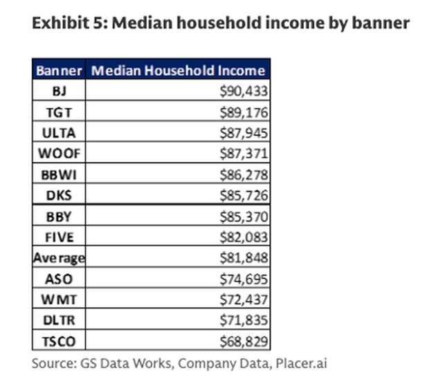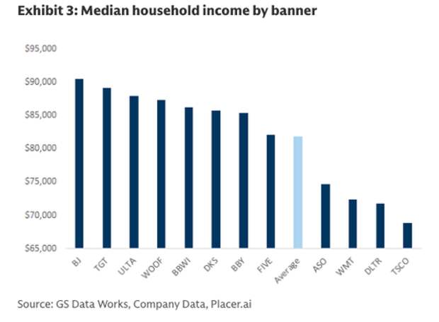 Using GS Data Works, company data, and Pace.AI, analysts led by Kate McShane determined the median household income by retailer, finding an average of about $81,848 across the retailers in the GS universe.