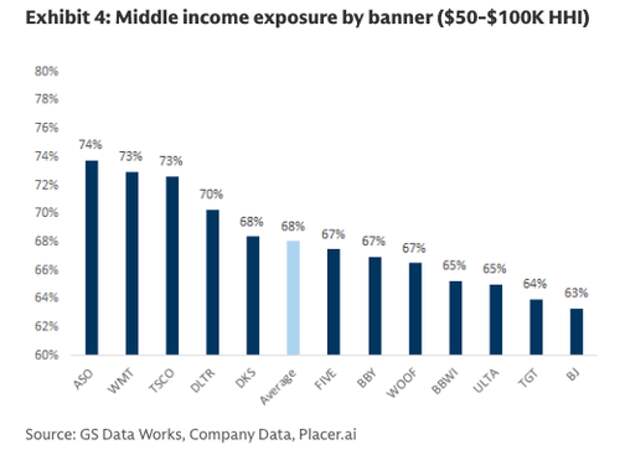 Lowest middle-income exposure: BJ’s Wholesale Club, Target, Ulta Beauty, Petco, and Bath & Body Works. These firms have the highest average household incomes.