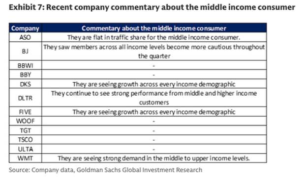 Goldman analysts examined twelve companies (all within the GS coverage) with high exposure to middle-income consumers, including Walmart, Best Buy, Target, BJ’s Wholesale Club, Tractor Supply, Academy Sports + Outdoors, Dick’s Sporting Goods, Ulta Beauty, Petco, Bath & Body Works, Five Below, and Dollar Tree.