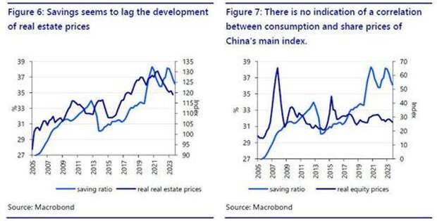 For about two decades, consumption in China has been partially suppressed since households had to channel an unusual large share of their income to savings in order to make the necessary down-payment for purchasing a house. Back then, this often boiled down to about 30% of the value of the house. In other words, consumption was substituted for expenditures on housing. Indeed last year we saw signs of the substitution effect when the savings rate for households dropped while real estate prices dropped as well. This effect is in sharp contrast with the findings of the wealth effect discussed in the academic paper mentioned earlier.