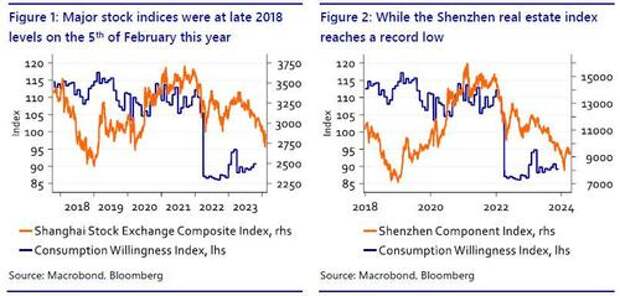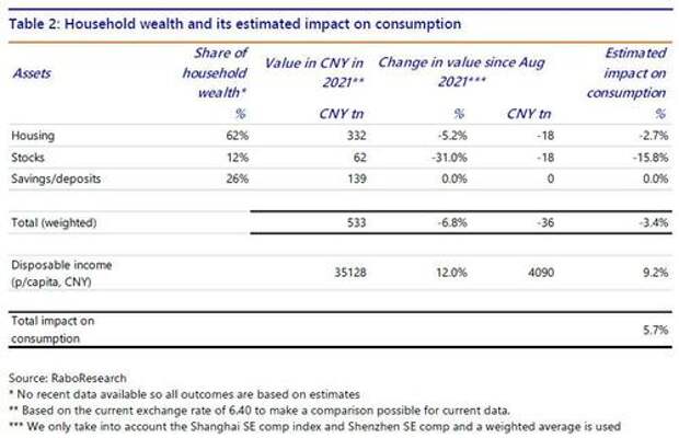 This is based on a total value of real estate in China of $55tn in 2021. So, if we assume the elasticities from this paper to be realistic, this suggests that the decline in asset values has depressed consumption by some 3.4% since August 2021. This would amount to a drop of consumption of more than $2 tn! Given a level of nationwide per capita consumption expenditure of 26.796, a total population of 1.425.000.000 people and the current USD/CNH exchange rate of around 7.25, this would boil down to a total amount of consumption of $5.3 tn. Our estimates above are generally inline with other research indicating that ‘a 5% decline in home prices will wipe out 19 trillion yuan ($2.7 trillion) in housing wealth’.
