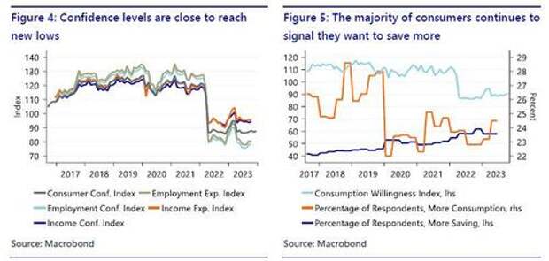 As can be seen from figure 4 below, surveyed consumers continue to signal weak confidence regarding developments related to employment and, related to it, income. Furthermore, consumer confidence is near record low levels. Moreover, close to 60% of respondents expect to increase savings in the next quarter while less than 25% of respondents indicate that they are expecting to consume more in the next quarter. We do note, though, that the most recent data is from Q2 2023.