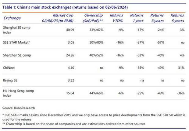 The structure of China’s stock market is important because it gives an idea of who has ownership and to what share classes. But for this it is clearly also relevant to have an idea about the total market capitalization of China’s main stock markets. This is why we show a table below that provides an overview of China’s stock exchanges ranked by market capitalization and which also includes the stock market returns YTD and for longer periods; It also provides an estimated breakdown between the share of private owned enterprises and state owned enterprises where available.