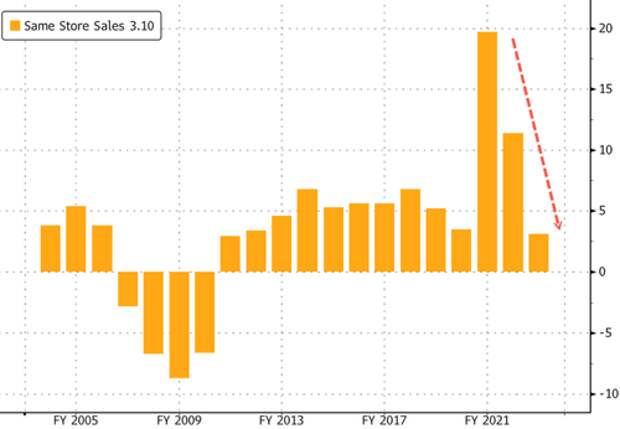 79 billion, down from $35.83 in the prior-year period. The figure still beat $34.61 billion that analysts surveyed by Bloomberg expected.Comparable sales, a key indicator of a retailer's health, fell 3.5%. The retailer predicted a 1% decline in comparable revenue for this year. Analysts have been expecting a rise of .2%.