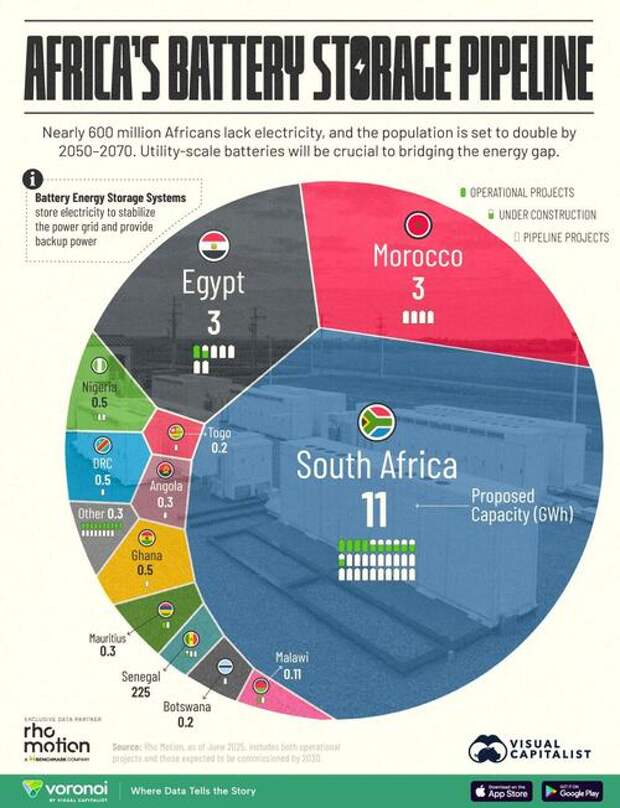 These technologies help stabilize energy supply, manage the intermittency of renewables, and support off-grid systems critical to expanding access.This visualization, via Visual Capitalists Bruno Venditti, highlights the continent’s battery storage pipeline, including projects that are operational, under construction, or in planning. It reveals both leading players and emerging markets in Africa’s energy storage landscape.